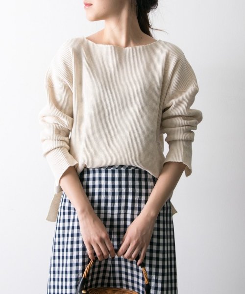 ワッフル目の粗いメンズライクな素材を使って、フォルムと細部のシルエットを女性らしく仕上げた1枚。ネックライン・袖口・裾の端のロック始末やスリット、前後差を持たせた着丈の設定など細かなディテールがシンプルなのにオシャレでこなれた印象をもたらしてくれます。お袖のボリューム感とゆるっとしたドルマン感もポイント◎