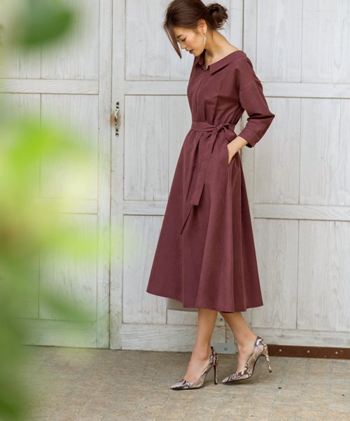 着るだけで品よく華やかに仕上がる、秋の雰囲気が漂うロング丈のワンピース。ベロア調のシャツ生地を使用しているため、テカテカとしたいやらしさのない上品な高級感があり、ハウスクリーニングも可能です。