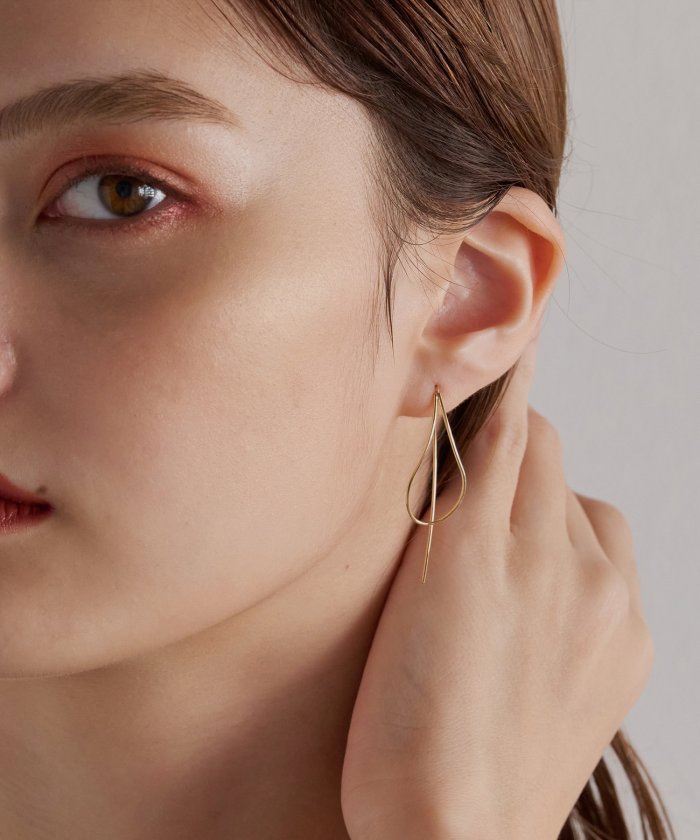 繊細な金線で手作りされたピアスは、耳たぶの後ろに揺れるロングポストが横顔をキリリと引き締める光のラインを生み出します。