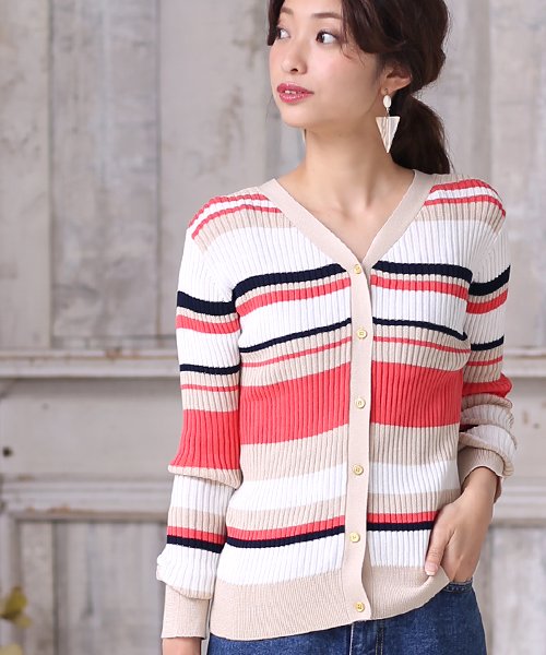 人気のマルチボーダーがカーディガンになって登場。 開きすぎないVネックがデコルテを綺麗に見せてくれます。
