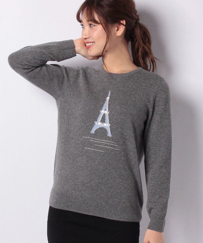 シンプルなタッチのエッフェル塔のジャガード織りが目を引くクルーネックのニット。遊び心のあるデザインを、カシミヤ100%のリュクスな着心地でキレイ目にシフトした1着。