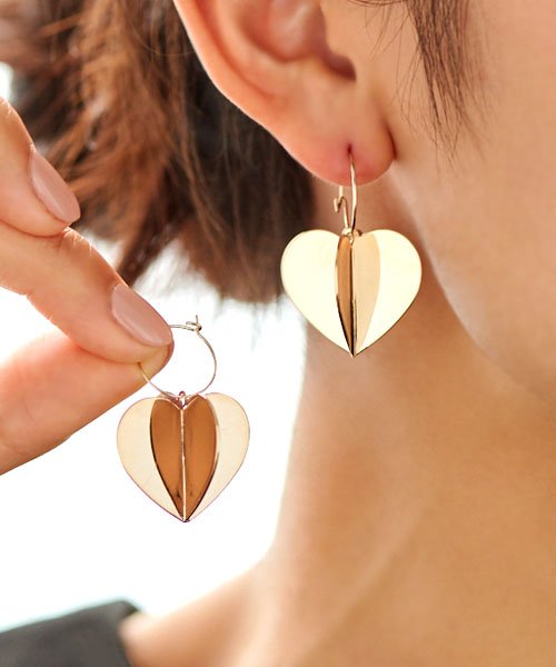 美しく磨かれたハート形プレートを交差させて重ねた、立体的なメタルプレス。