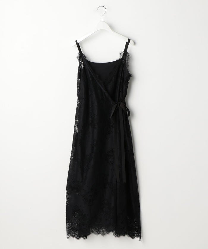 グランド部分がきめ細かく織られた珍しいラッセルレースを使用したラップ式のキャミソールワンピース。パンツをレイヤードしてカジュアルに着るのもおすすめです。インナーキャミソール付き。
