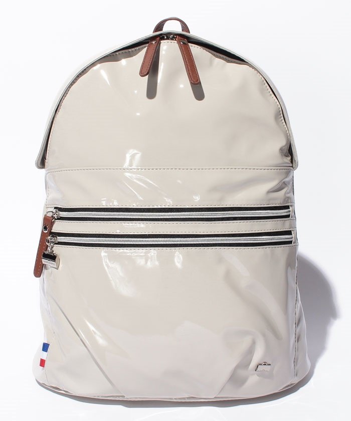 光沢のある素材がインパクトを与えるバッグ。 平行にあしらわれた2本のファスナーがデザインのポイントです。 引き手部分とフロントのメタルチャームがアクセントをプラス。 背面から物を取り出せる仕様も魅力のひとつです。