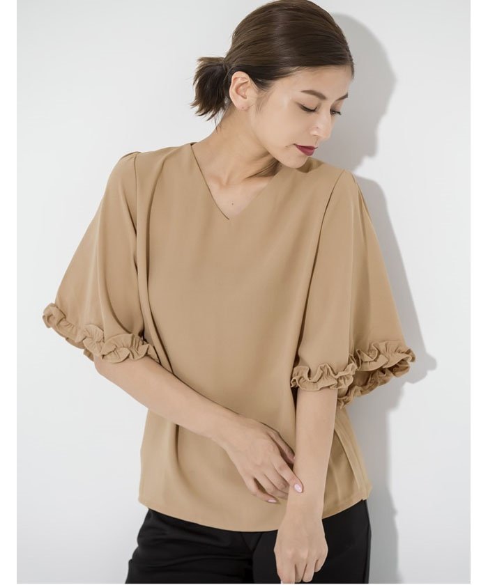 深めのVネックラインと、袖にあしらったフリルが女性らしいブラウス。