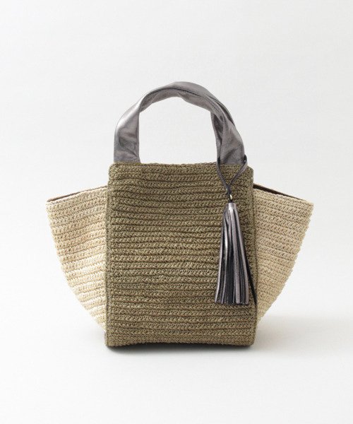 ハンドルには上質なレザーを用いることにより大人が持てる1点。素材はアバカという強度が強い麻の一種。フィリピンの職人がすべて手作業で編込んでいます。取り外し可能な底部が付いているので、クシュッと持ちたい時には外してお持ちいただけます。