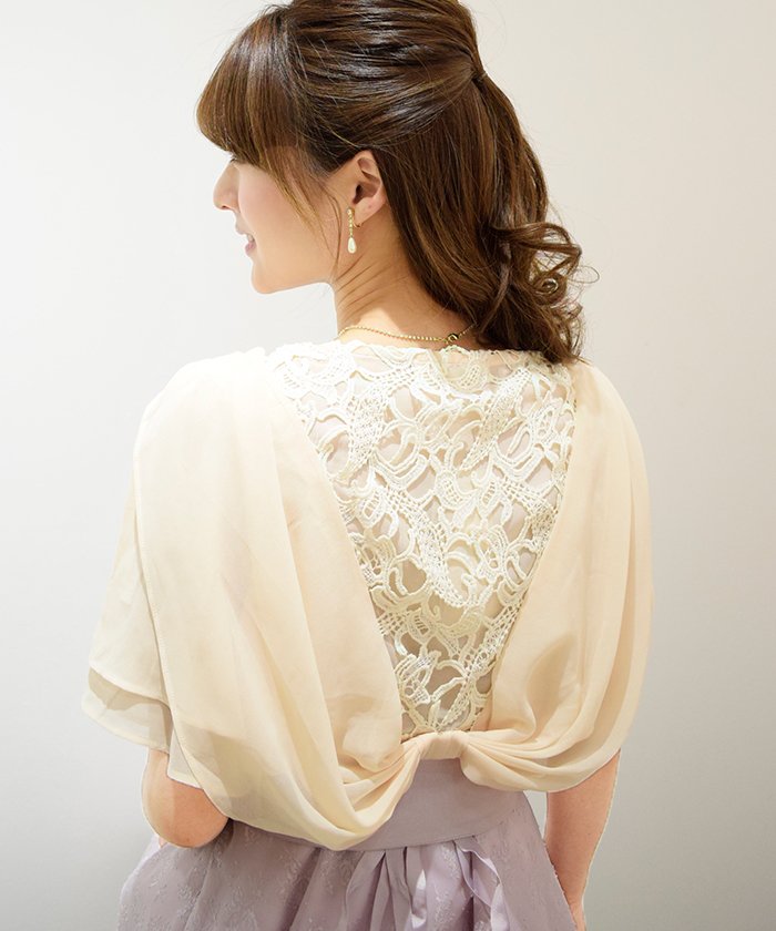 背中の一部をどこかアンティークレースのような華やぎ香るレースで切り替えたボレロ、ふわふわのシフォンが動きに合わせてエアリーに揺らめき、可憐な表情を誘います。パーティースタイルの仕上げに嬉しい1品。