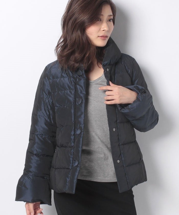 ボリュームのあるショールカラーと袖口のフレアデザインが華やかな、ショートタイプのダウンジャケット。深みのある光沢素材が、カジュアルになりがちなダウンアイテムをちょっぴりドレッシーにシフト。