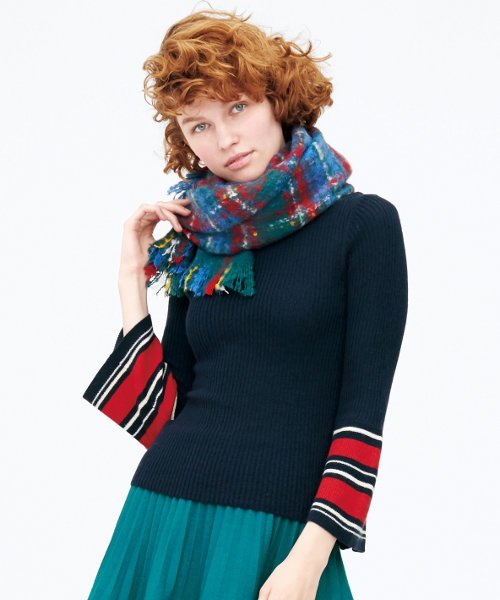 袖口のマルチボーダーがポイントのレトロなニットプルオーバー。袖の色は、何通りもの配色パターンをシュミレーションして検証し、一番バランスの良いボーダーピッチと配色になるように仕上げたこだわりの一着!袖丈が7分のため、フリルが邪魔になりにくく、アウターも羽織りやすいです。今年トレンドのマルチボーダーをTo b.らしく抵抗なくおしゃれに着られるのがおすすめポイント!