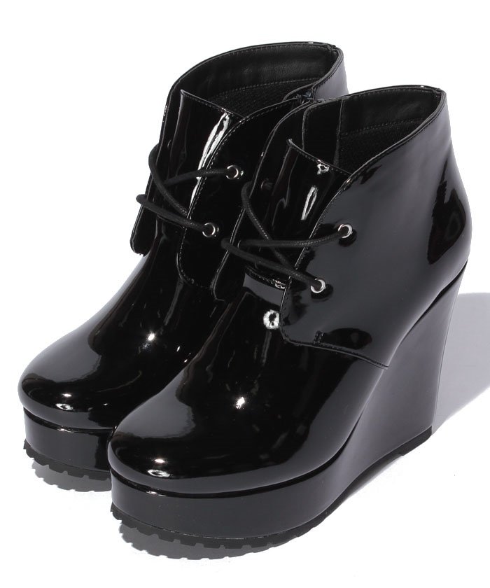 ボリュームのある厚底ウェッジソールが、足元をインパクトたっぷりに彩るフェイクエナメルショートブーツ。ちょっぴりクラシカルな雰囲気香るレースアップデザインで、大人めコーディネートにもマッチしてくれそう。