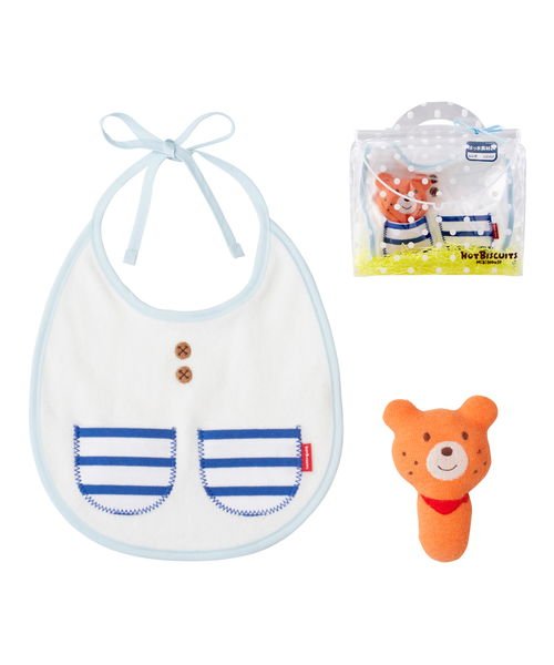 ミニポケットが付いたスタイと、ビーンズくんとキャビットちゃんのやわらかラトルがケースに入っているので、贈りものとしても◎。