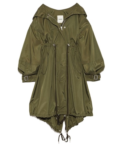 シャリ感のあるポリエステル素材を使用したオーバーサイズのモッズコート。薄手でありながら、程よくハリと艶があるので、リッチな雰囲気で着こなすことができます。