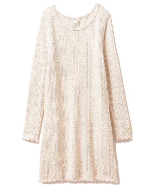 立体感のあるジャガード織りで、プレッツェル×ハートをイメージした柄を描きました。伸びがよく、ふんわりとした着心地のワンピースは、裾と袖を女性らしいメロー仕上げています。色は、ピンクと、都会的なボーダー柄と異なる表情で揃えています。