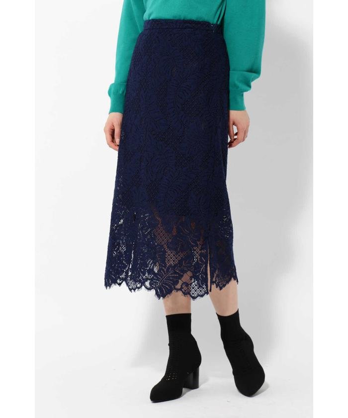 上品なレースを使ったIラインシルエットのレーススカート。ミモレ丈が上品な雰囲気で、裾のスカラップデザインが軽やかで高級感あるムードを演出します。短めにつけられたインナーが程よく肌を露出し、大人っぽく女性らしい仕上がりになっています。Tシャツと合わせてカジュアルダウンさせても、ブラウスと合わせて大人っぽく決めても◎。一枚取り入れるだけで一気に春を先取りできるアイテムです。