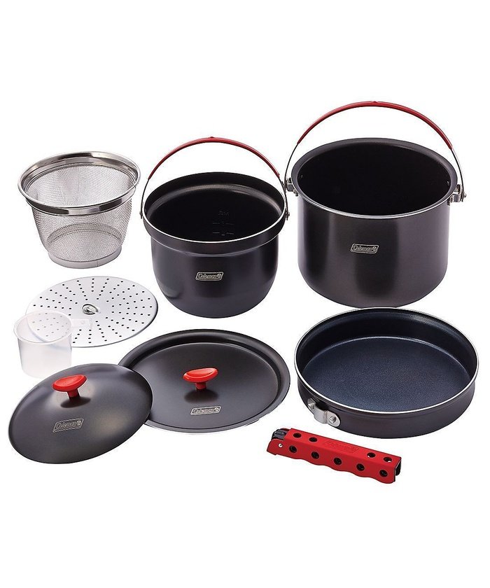 ライスクッカーも付いたクッカーセット●使用時サイズ:ポット/約?22×17(h)cm、ライスクッカー/約?19×18(h)cm、フライパン/約?22.5×4(h)cm ●収納時サイズ:約?25×20(h)cm ●総重量:約3kg ●本体/アルミニウム(ノンスティック加工)、ステンレス、ハンドル/アルミニウム、スチール、シリコン、ケース/ポリエステル、内蓋/アルミニウム、ザル/ステンレス、メジャーカップ/ポリプロピレン