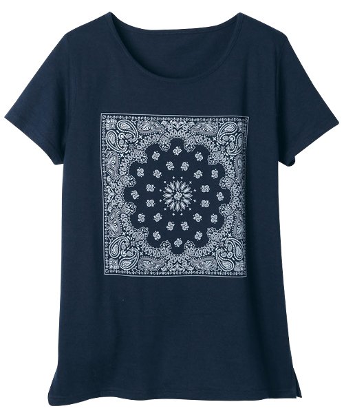 バンダナ柄の旬顔プリントT。シックな色使いにゆるっとしたサイズ、やや長め丈が大人にマッチ。