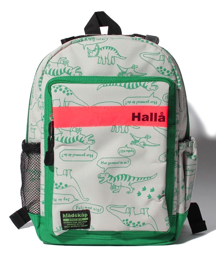 スウェーデン語でおしゃべりをする恐竜たちの姿を描いた、スタイリッシュな総柄リュックです。アクセントカラーのテープへロゴをデザインした、遊び心のあるディテールがポイント。正面とサイドのほか、内側にもポケットをあしらい、荷物を整理しやすく仕上げたアイテムです。