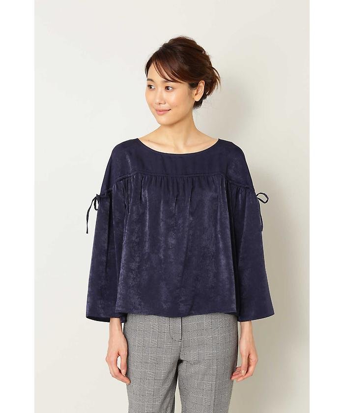 光沢感で旬なルックスに仕上げるギャザーブラウス。リラックスした裾広がりなフォルムで着心地良く、デコルテ切り替えから袖にリボンを結んだデザイン。チェックパンツやワイドパンツまで着回しができ、1点投入で今年らしいコーディネートが完成します。