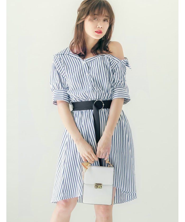 ベルト付きオープンショルダーパフ袖シャツワンピース