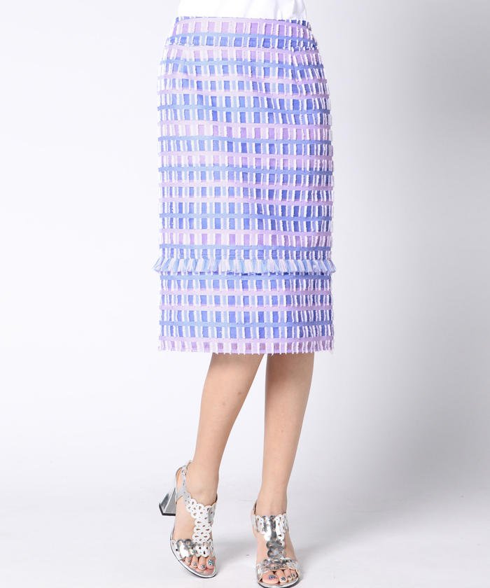 透け感のあるカットジャカードを使用した春らしいスカート。淡く優しげな印象のピンク、ブルー、パープルのカラーを組み合わせ、スクエア柄に仕上げた生地は他にはなく特別感がありますね♪生地の柄や表情を最大限に生かすため、ベースのシルエットはシンプルなストレートラインにしています。スカート下部の切り替えに別素材でお作りしたこだわりのフリンジパーツを挟み込み、さりげないアクセントにしています。膝が隠れる長めの丈でも後裾がベンツ開きになっているので歩きやすいのも嬉しいですね◎!すっきりとしたシルエットと大人っぽく上品な長めの丈感で、穿くだけで女性らしさが手に入るアイテムです。同素材を使用したフレアスリーブブラウス(2613-70054)もございます。