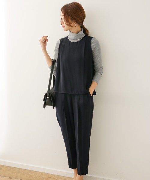 上品な印象で着て頂けるオールインワン。 サラリとした生地感が着て頂きやすく、 パンツ部分もテーパードが効いておりスッキリしたシルエットなので、スタイルアップ効果があります。そんなパンツにAラインのブラウスがレイヤードされたデザイン。 デイリーユースはもちろん、ちょっとしたパーティーなどにも着て頂けるアイテムです。