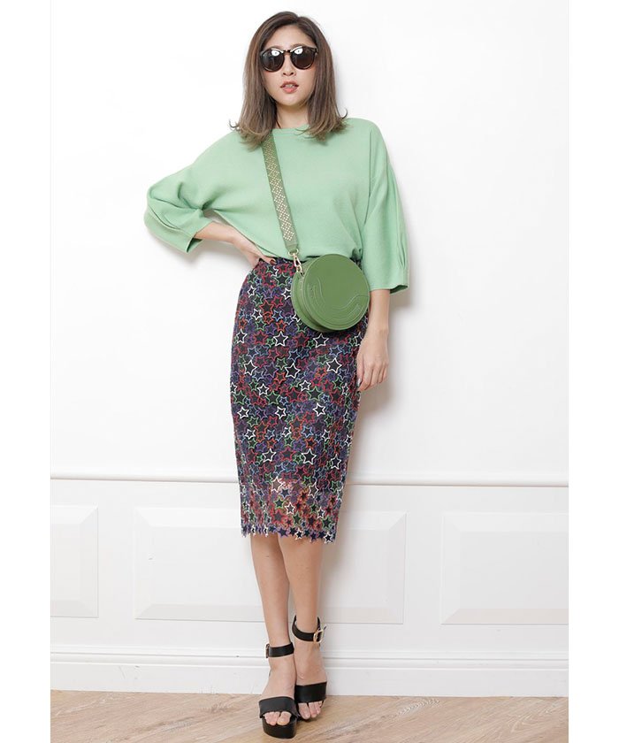ポップな配色バランスの星モチーフでチャーミングな一面を表現。ほどよい長さのレングスに、タイトなシルエットで品良くまとめた、大人可愛いスカートです。