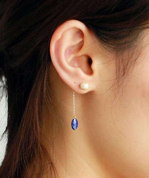 温かみのあるコットンパールと深みのあるカラーが落ち着いた印象のピアス。「幸運の石」と呼ばれるラピスラズリと「希望の石」と呼ばれるアマゾナイト。石の表面には細かなカットを施し、さりげなくきらきらと光ります。ゆらゆら小さく揺れる石が可憐で女性らしく、顔周りを華やかに見せてくれます。