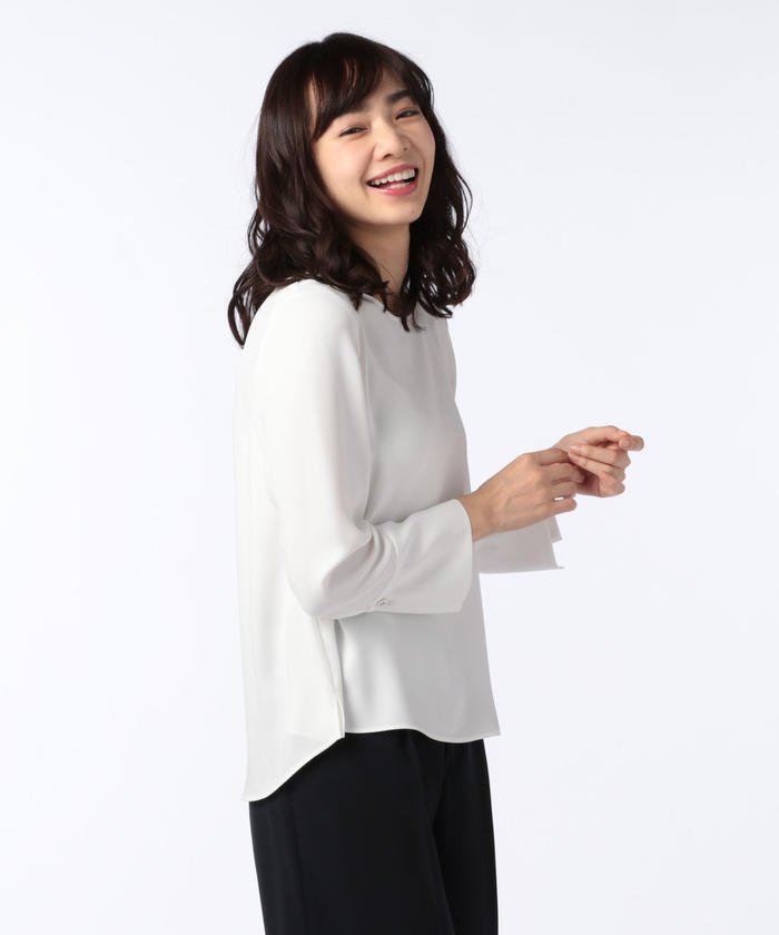 軽やかで品のある生地で仕立てた春らしいブラウス。風をはらんでエアリーに揺らめき、コーディネートを女性らしい雰囲気に演出します。装飾のないシンプルさと、今年らしさを感じさせる細部のデザインも魅力。スリットカフスと前後差のあるヘムラインが特徴です。多彩なボトムと相性がよく、日常から通勤まで幅広く活躍します。