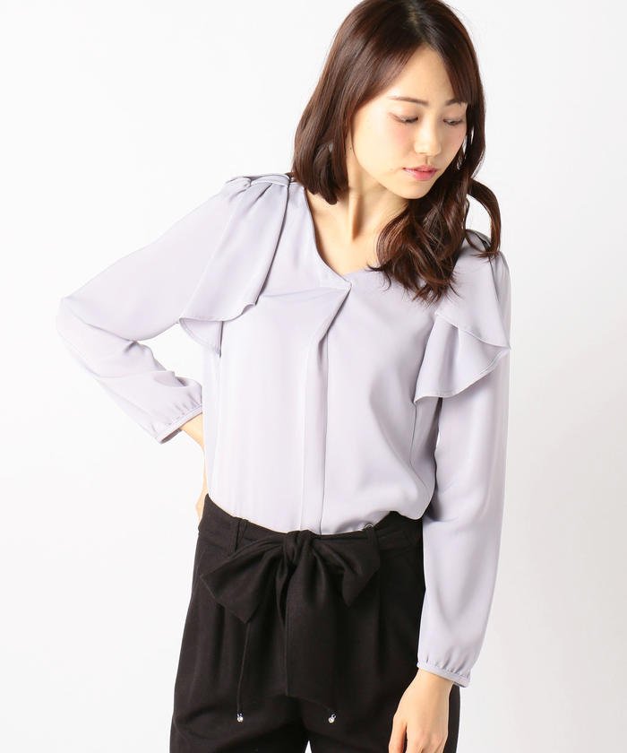 肩ラッフル長袖ブラウス