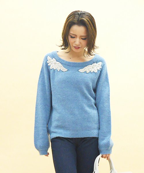 首元にビーズとビジューモチーフをあしらったドルマン型のニットトップス。