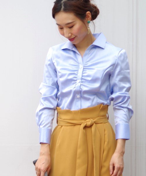 胸元にギャザーを寄せ、立体感を出した長袖シャツです。面持ちをシャープに引き立てる、スタンドカラーデザインを採用しました。微光沢の上質なツイル素材は、優美な着こなしを演出。エレガントさがあり、フォーマルシーンにも対応する1枚です。身頃は前後に切り替えを施して、すっきりとしたシルエットをメイク。透け感なし。