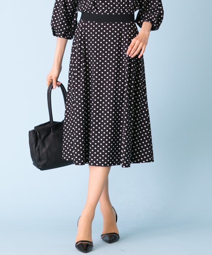 【WEB限定・セットアップ】とてもストレッチ性のある素材にドットをプリントしたスカートです。サイドにタックデザインのあるフレアーのシルエットになっていて、ファスナーもアクセントになっています。ウエストゴムとウォッシャブルが嬉しいポイントです!(セットアップ:ブラウス…*801969)